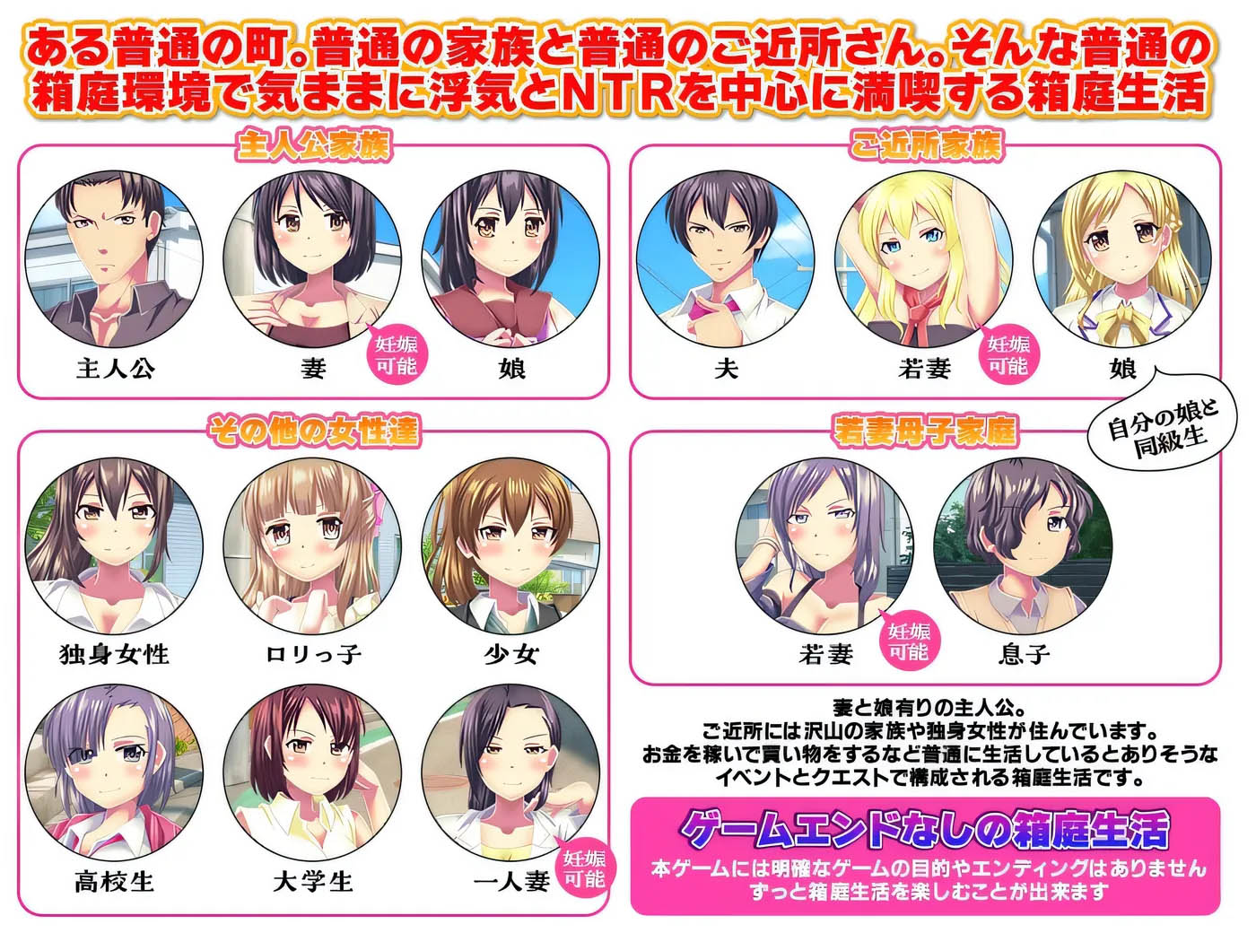 游戏设定在一个普通的小镇,这里住着普通的家庭和普通的邻居,整体环境宛如一个精心布置的盆景,看似平静祥和。然而,在这看似普通的表象之下,却隐藏着复杂而微妙的情感纠葛。玩家将扮演主人公,拥有妻子和女儿,在这个看似平凡的家庭背后,开启一段以出轨和NTR为中心的别样生活。